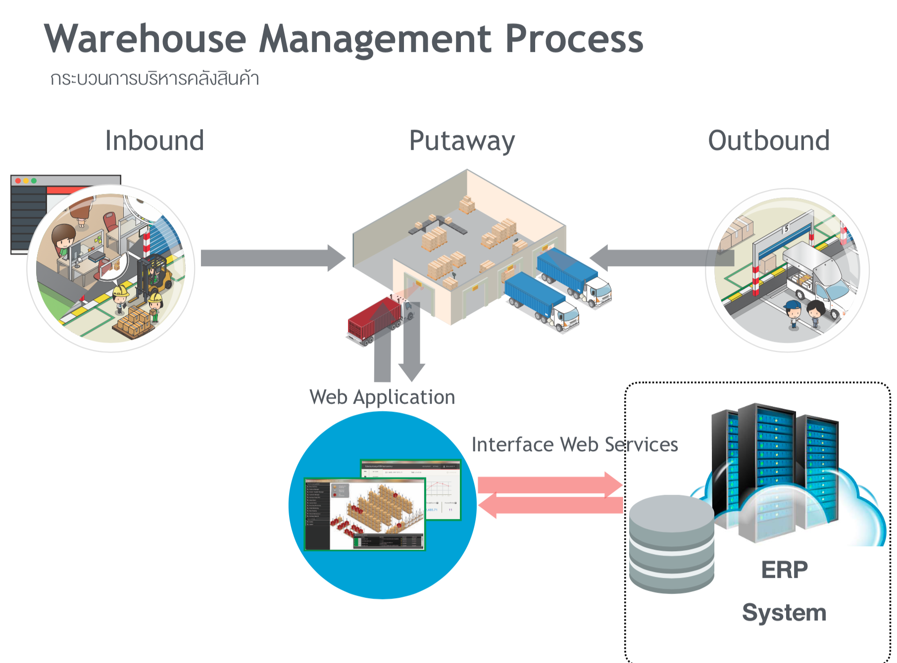 WMS คือ ระบบโปรแกรมที่พัฒนาขึ้นมาเพื่อใช้ในการบริหารระบบคลังสินค้าทั่วไป ที่รับสินค้า เก็บสินค้า และกระจายสินค้า ระบบโปรแกรมประกอบด้วย ระบบงานหลัก 3 ระบบ คือ