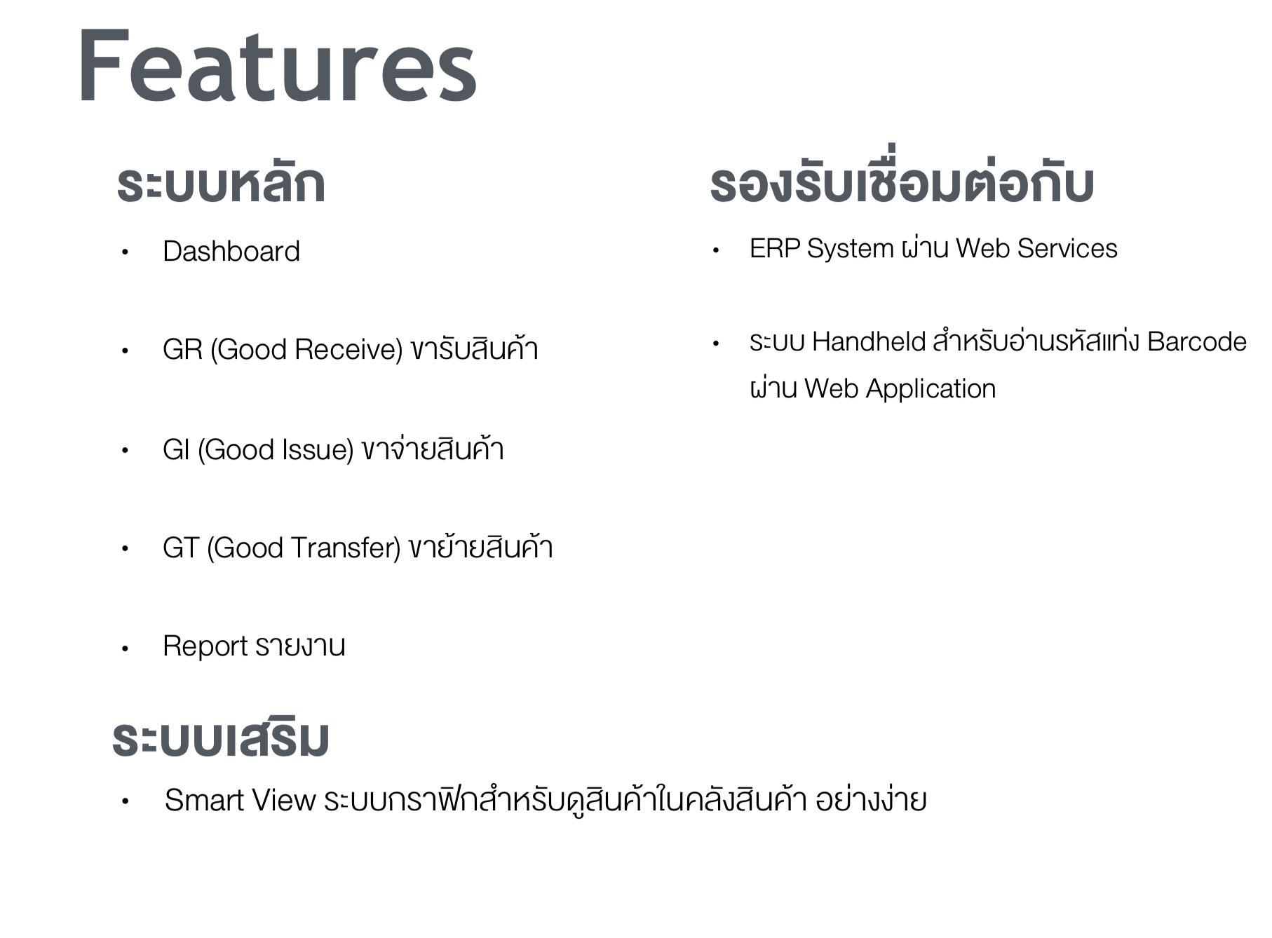 - สนับสนุนการใช้ระบบ Barcode ในการจัดการสินค้า โดยจะช่วยในการจัดการระบบงานต่างๆ ตั้งแต่ การรับสินค้าเข้าคลัง,